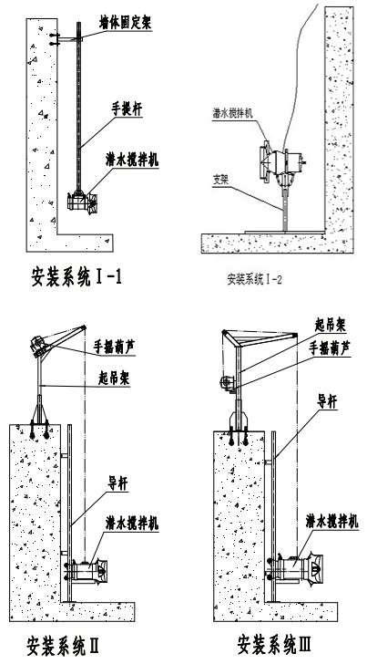 當(dāng)池深H<4米時(shí)建議采用安裝系統(tǒng)一。潛水?dāng)嚢铏C(jī)的潛水深度可以根據(jù)需要進(jìn)行垂直方向的調(diào)節(jié),而且在水平賣弄內(nèi)可繞導(dǎo)桿旋轉(zhuǎn)的最大角度為正負(fù)60°起吊系統(tǒng)底座、支撐架和下托架與池的有關(guān)連接面均采用膨脹螺栓固定,無需預(yù)留孔。安裝系統(tǒng)二用導(dǎo)向鋼繩替代導(dǎo)桿,具有運(yùn)輸方便,現(xiàn)場安裝簡單等特點(diǎn)。該系統(tǒng)從根本避免了由于運(yùn)輸引起導(dǎo)桿彎曲的、變形從而影響正常使用的情況,并有效改善了池深過深情況下,由于導(dǎo)桿的安裝誤差而導(dǎo)致的無法正常起吊等現(xiàn)象。在有懸臂池頂?shù)陌惭b條件下更顯得操作方便可靠。